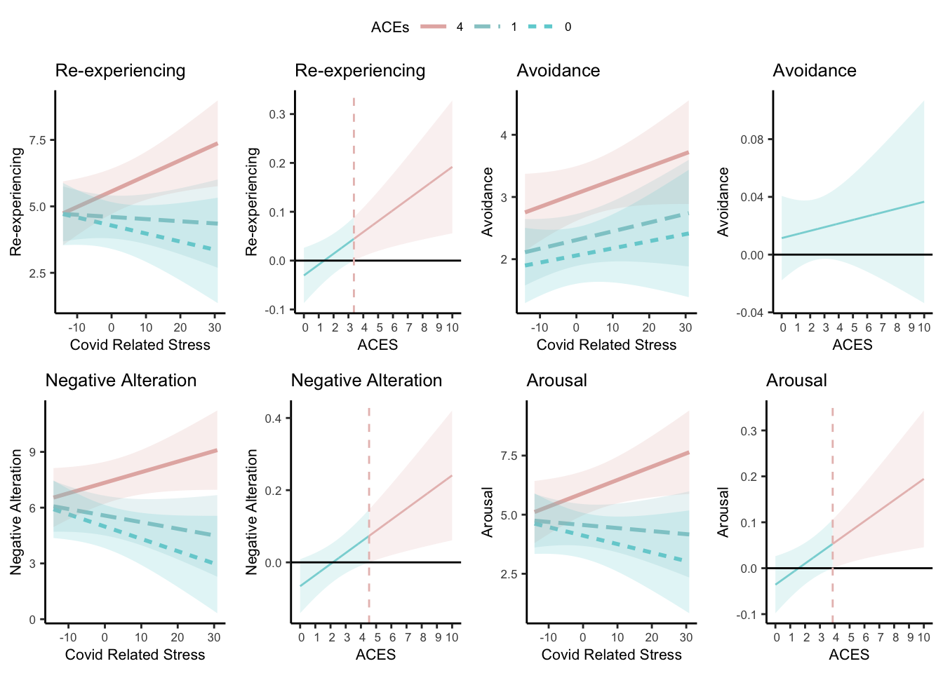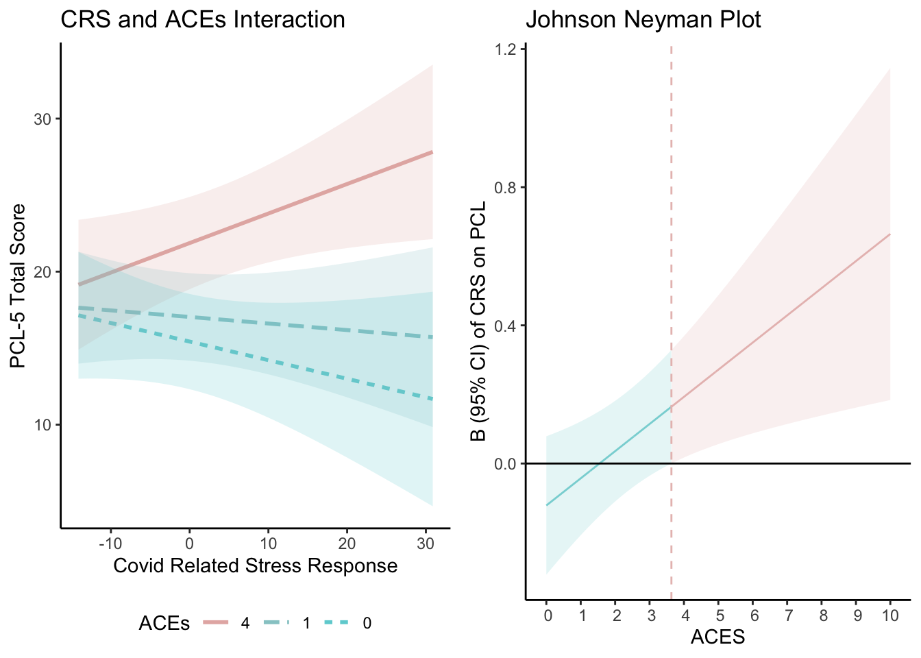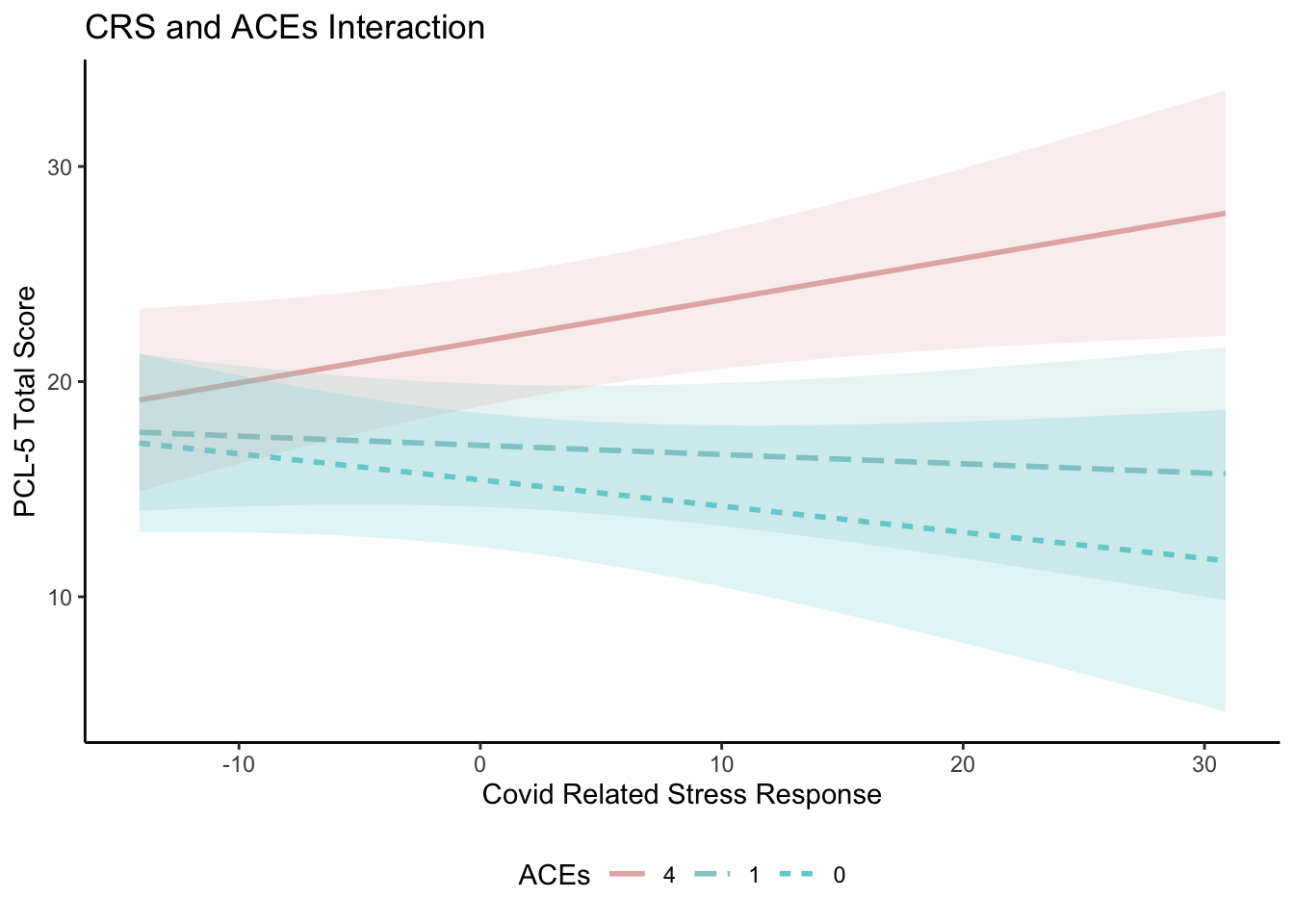 These results suggest that ACEs may moderates the relationship between CRS and PTSS severity. More specifically, Individuals who report 4 or more ACEs have significantly higher PTSS based upon CRS compared to those who report less than 4 ACEs. The level that the interactive effect becomes signiicant is at 4 ACEs.