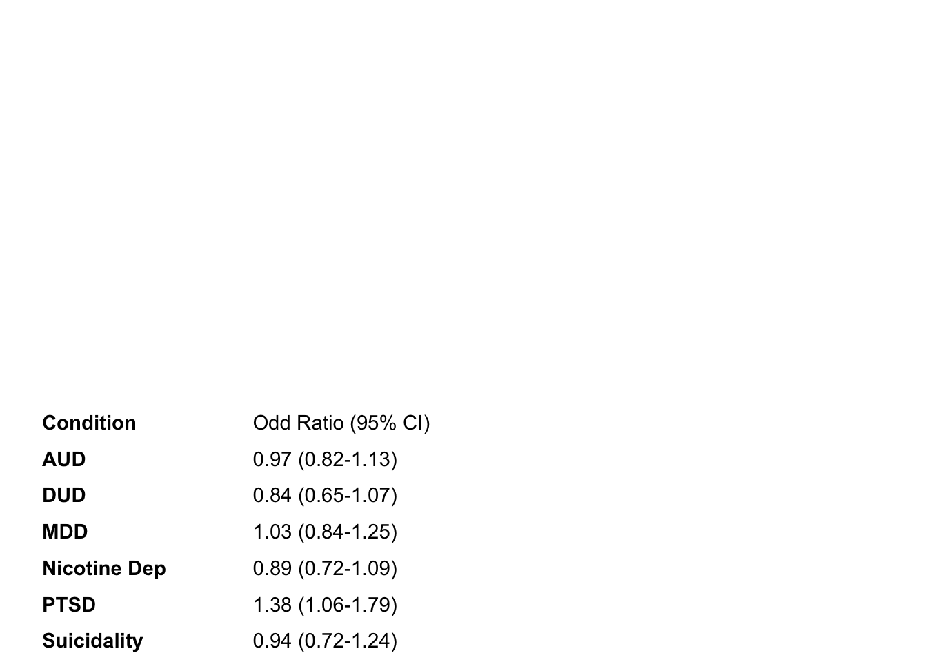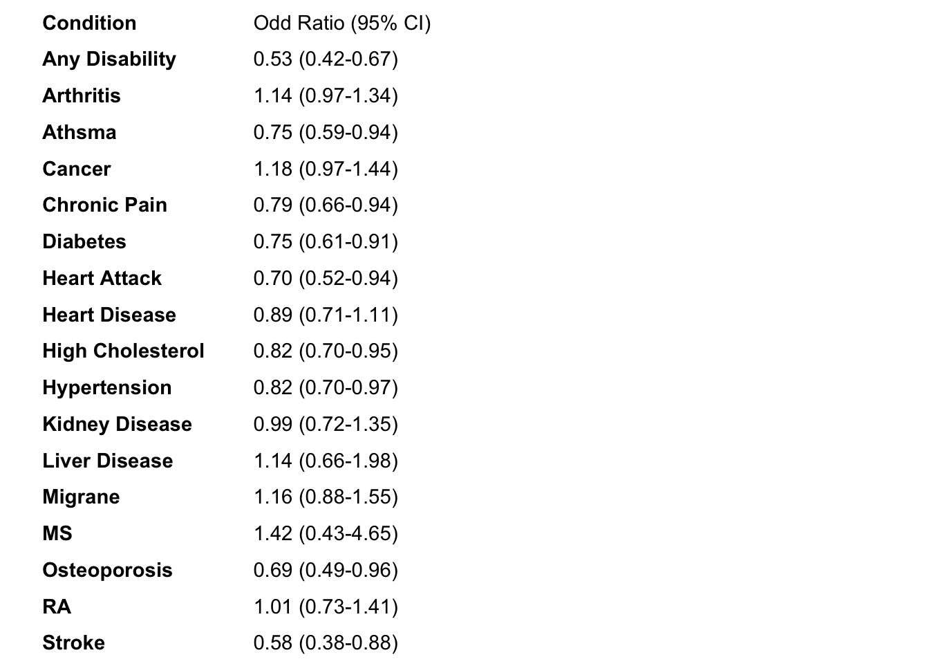 | Arthritis | 0.0253985 | 0.9749213 | 0.8073022 | 1.1773430 | 0.97 ( 0.81 - 1.18 ) | 0.7918852 | 0.03 % |