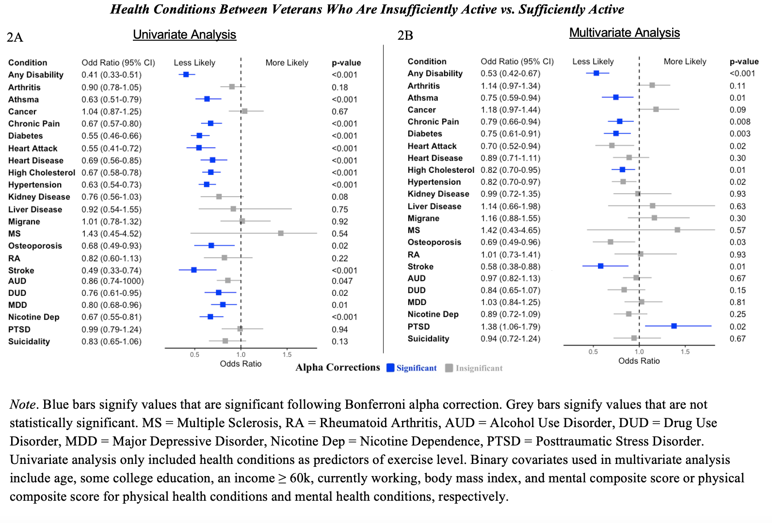 Note. Blue bars signify values that are significant following Bonferroni alpha correction. Grey bars signify values that are not statistically significant. MS = Multiple Sclerosis, RA = Rheumatoid Arthritis, AUD = Alcohol Use Disorder, DUD = Drug Use Disorder, MDD = Major Depressive Disorder, Nicotine Dep = Nicotine Dependence, PTSD = Posttraumatic Stress Disorder. Univariate analysis only included health conditions as predictors of exercise level. Binary covariates used in multivariate analysis include age, some college education, an income ≥ 60k, currently working, body mass index, and mental composite score or physical composite score for physical health conditions and mental health conditions, respectively.