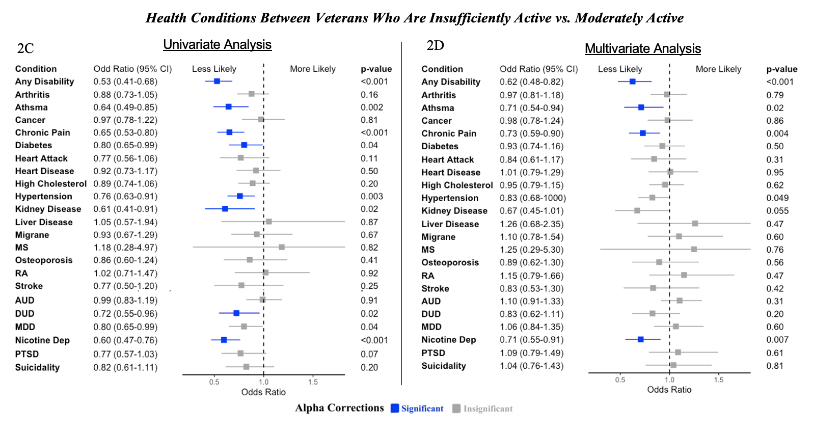 2B: Multivariate. For less health conditions are there differences between physical activity level. Compared to veterans who are insufficiently active, those who are sufficiently active are less likely to report any disability, asthma, chronic pain, diabetes, and hypertension. No other differences were observed between the odds of reporting other conditions between insufficient and moderate activity.