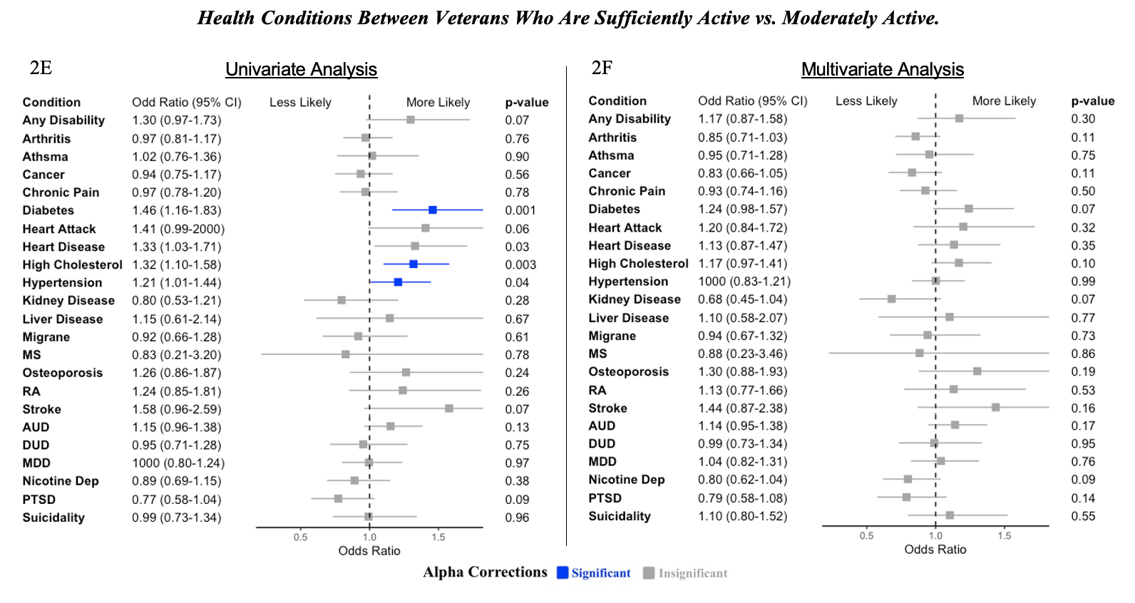 2D: Multivariate. Compared to veterans who are insufficiently active, those who are moderately active are less likely to report any disability, asthma, chronic pain, diabetes, high cholesterol, and stroke. No other differences were observed between the odds of reporting other conditions between insufficient and moderate activity.